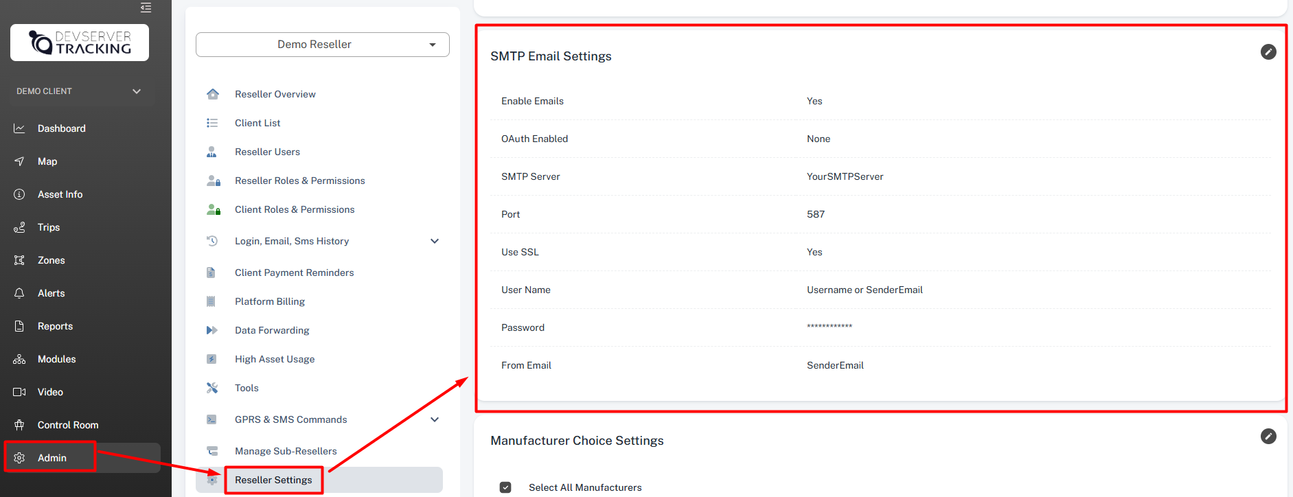 To enable email alerts and scheduled reports on the system you must input SMTP settings for an email account. You can do this in the Reseller SMTP settings section in the admin panel.