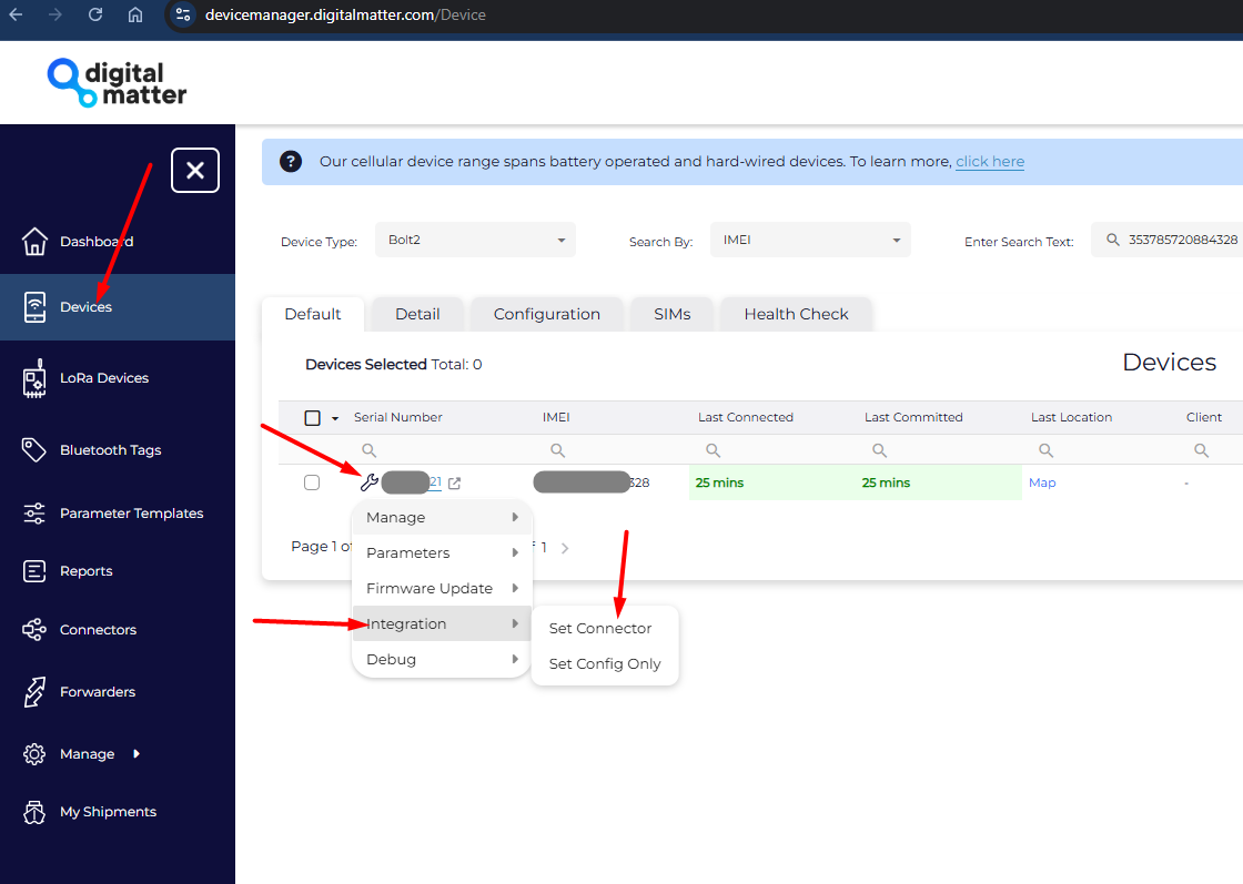 Lastly, add the device to the Platform, then monitor its connection status. Once the device shows as ‘Connected’ and ‘Committed’ on the Digital Matter platform, data should be received on WLT Platform.