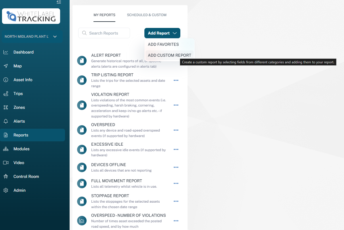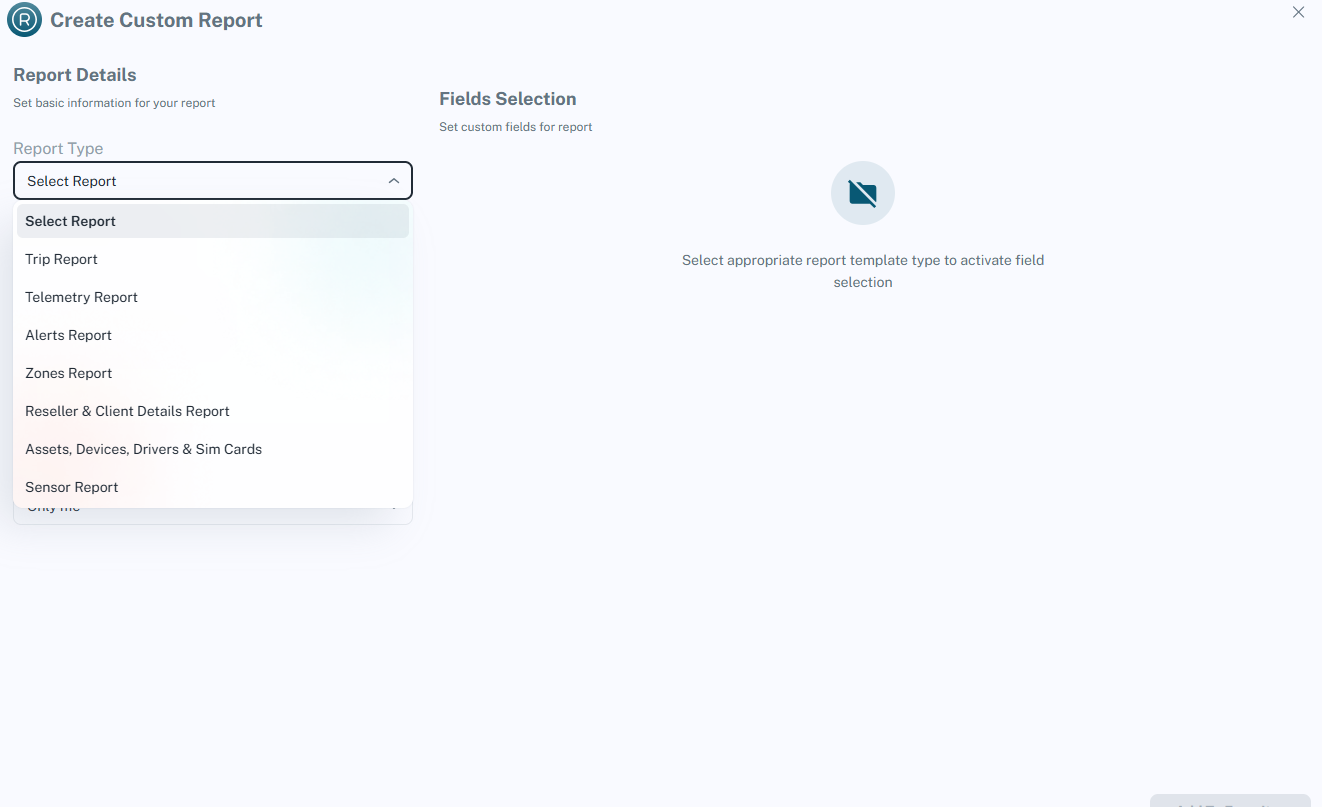 The Custom Report feature allows users to generate tailored reports by selecting specific data fields relevant to their operational needs (e.g., trips, telemetry, alerts, assets, or devices). This helps produce focused reports for analysis, monitoring, or client reporting.
