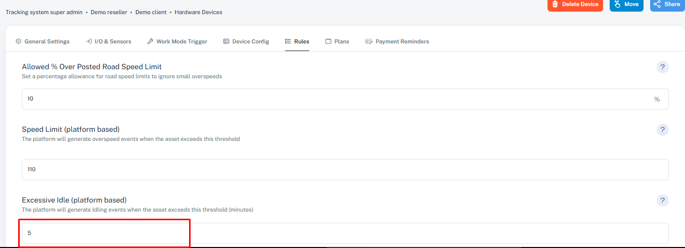 The Excessive Idling feature allows fleet managers to monitor and control unnecessary engine idling. Prolonged idling wastes fuel, increases emissions, and contributes to engine wear. By setting a threshold, the system automatically generates alerts and reports whenever a vehicle exceeds the allowed idle time.